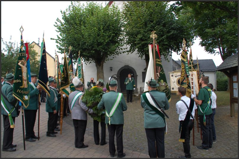Anschließend erfolgte die Übergabe der Bezirksfahne und des Ehrenschildes des Schützenbundes, welches von der Bruderschaft Hambuch im letzten Jahr getragen wurde, an die gastgebende Bruderschaft.