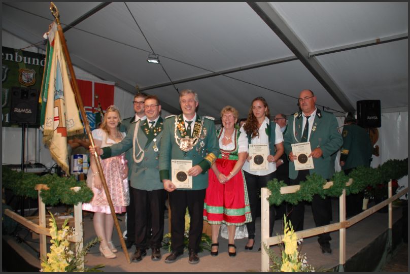 Nachdem sich die Fahnenabordnungen aufgestellt hatten, wurde jedes Königspaar auf die Bühne gebeten, den anwesenden Gästen vorgestellt und erhielt aus den Händen des Bezirksbundesmeisters und gleichzeitigem Brudermeister der St. Hubertus Schützenbruderschaft Reudelsterz, Norbert Steffens , ein kleines Präsent.