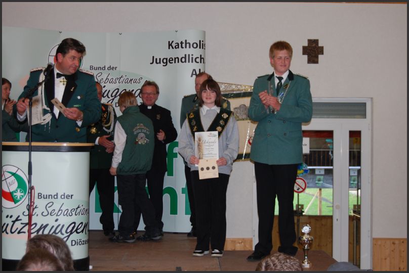 Beim Diözesanjungschützentag in Obermendig hatte unser Bezirksverband allen Grund zum jubeln. Gleich zwei Teilnehmer qualifizierten sich für das Bundesprinzenschießen am 17.10.2009 in Gemünd. Chantale Theisen aus der Bruderschaft Mayen erreichte mit 30 Ringen und dem 4.Platz die Qualifikation in der Schülerklasse. Unsere Bezirksschülerprinzessin Jennifer Krämer verpaßte auf dem 5.Platz liegend die Qualifikation nur knapp. Einen besonderen Grund zum jubeln hatte dann die Bruderschaft aus Nitztal. Tobias Kessner errang mit 28 Ringen den Titel Diözesanjungschützenprinz 2009. Tobias hatte sich als zweitplatzierter beim Bezirksprinzenschießen für das Schießen um den Diözesanprinz qualifiziert. Wir wünschen den beiden viel Erfolg in Gemünd