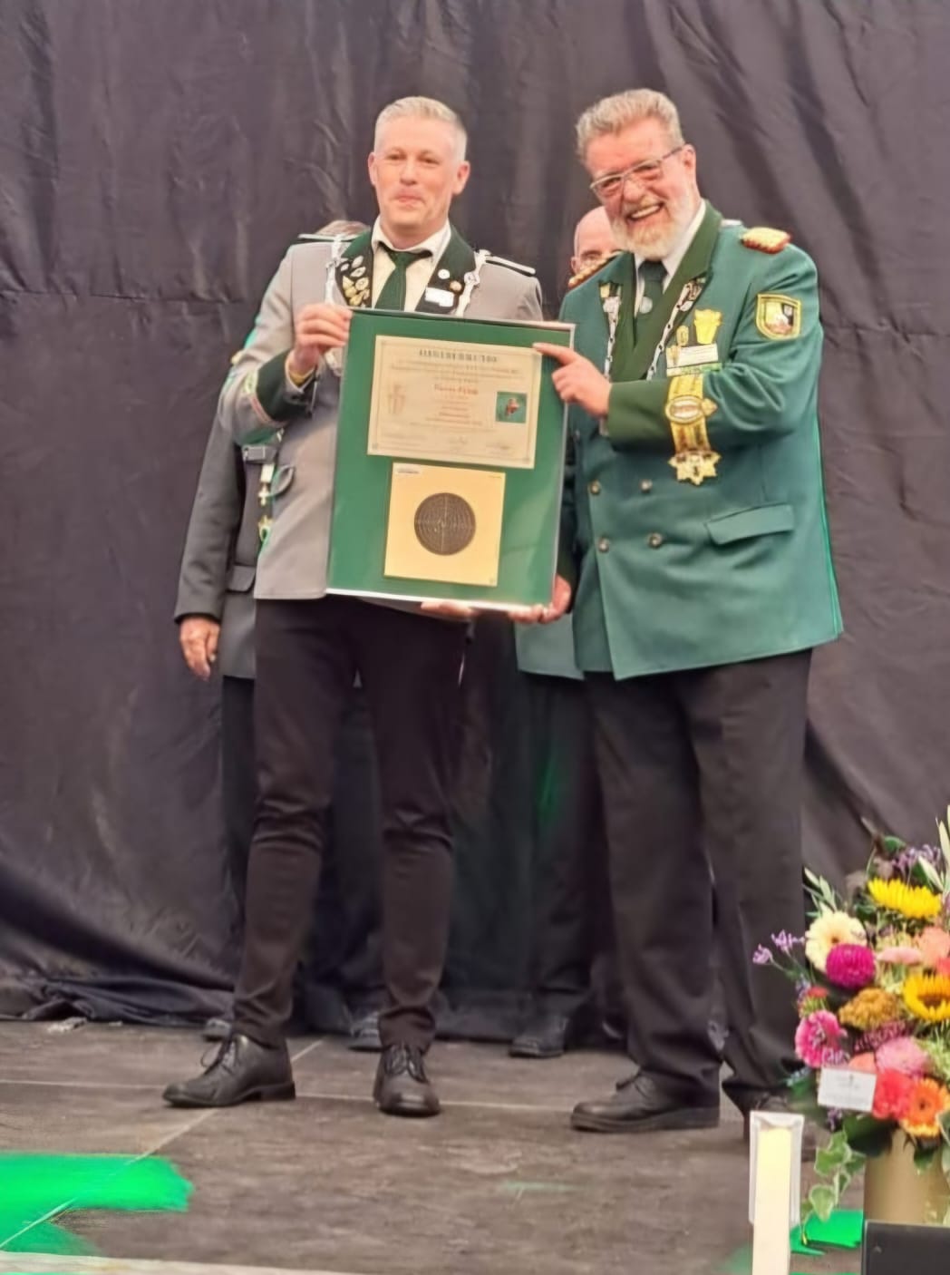 Auf dem Bundesschützenfest in Rietberg setzte sich Pierre mit 27 Ringen gegen seine Konkurrenz durch. Er erreichte mit seinen geschossenen 10,9,8 und einem Teiler von 1913 den 4.Platz von 78 Startern. Nach einem erlebnisreichen Wochenende wurde Pierre am Sonntagabend in seiner Heimatbruderschaft in Mayen von zahlreichen Schützen seiner Bruderschaft und des Bezirksverbandes Maria-Laach empfangen. Wir wünschen Pierre ein schönes Jahr als Diözesankönig. |